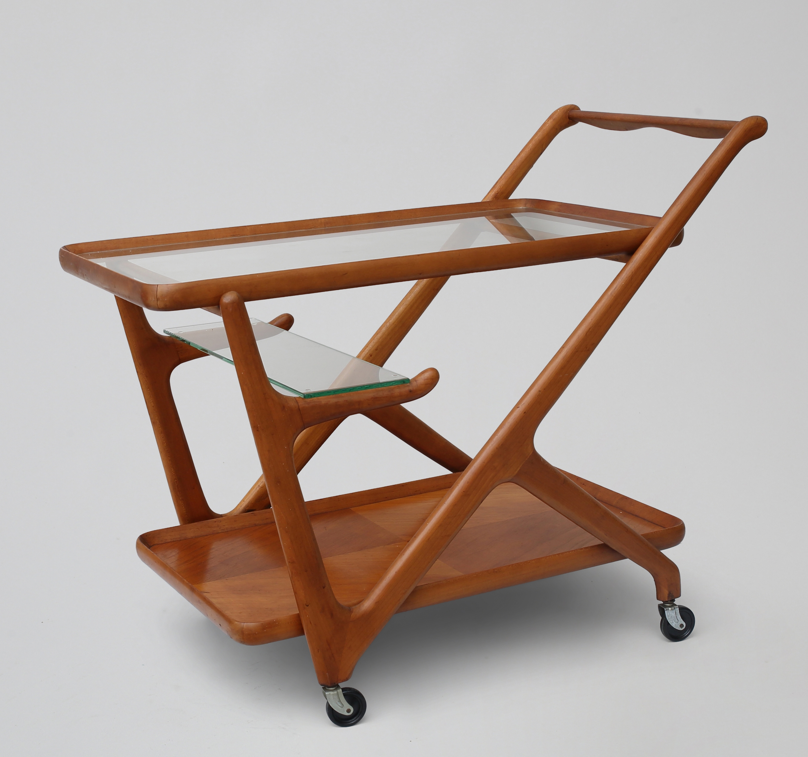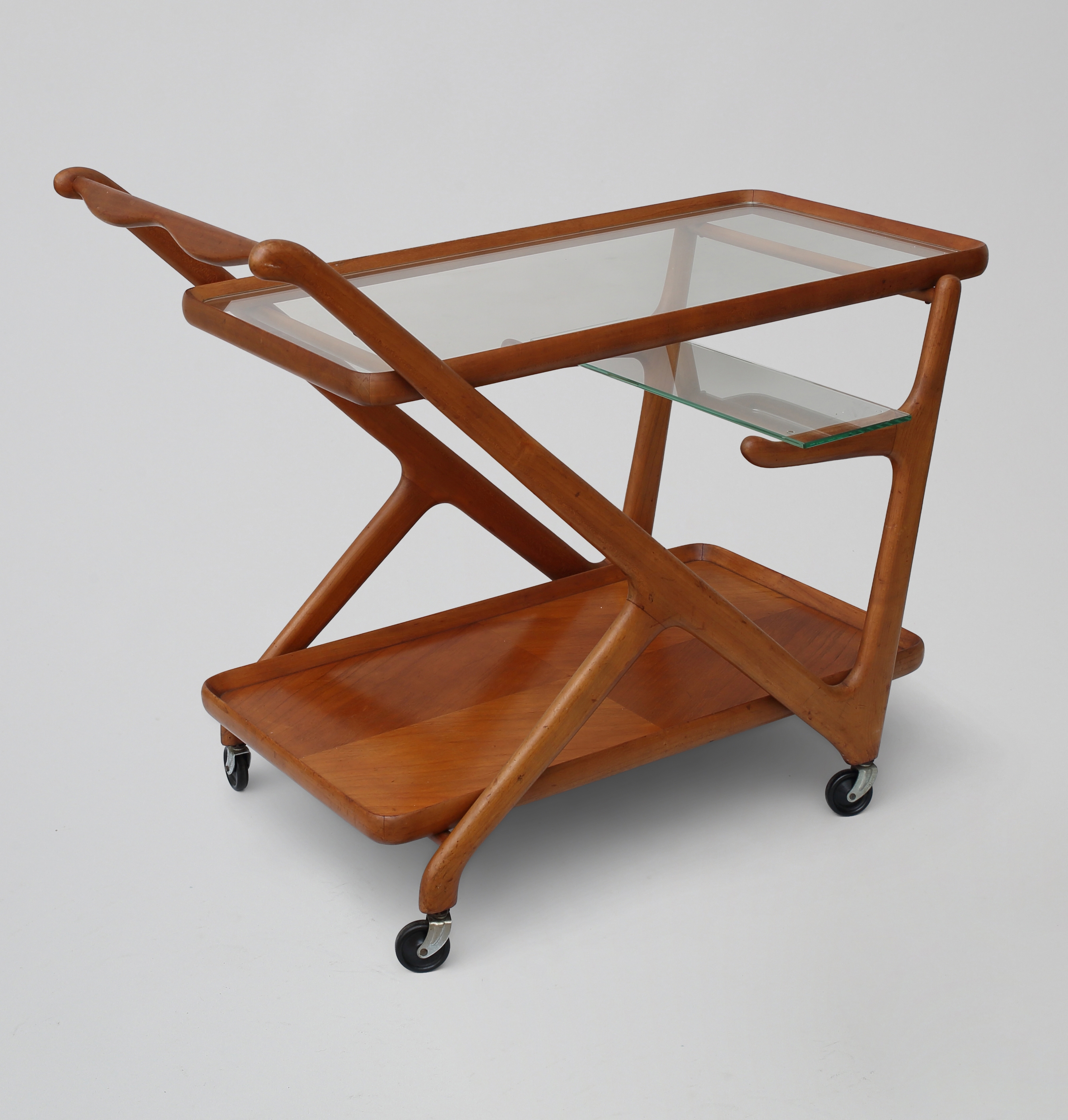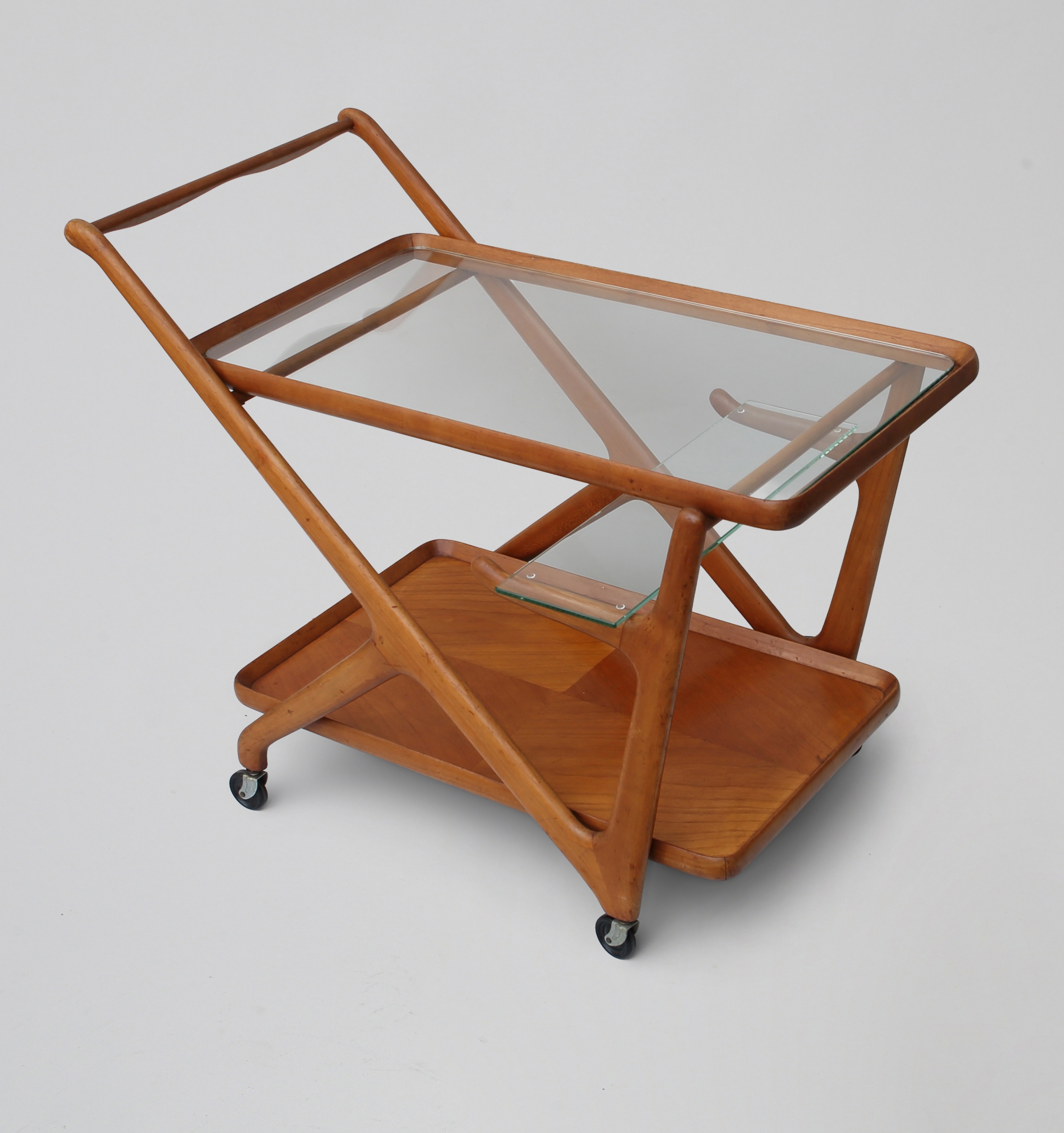 Cesare Lacca serving trolley from the 1960s, an elegant example of Italian modern design. The organic wooden frame, the glass top and the removable tray clearly express the refined formal language and functional approach that are characteristic of Lacca’s work. The design was first developed in 1951 for Cassina.