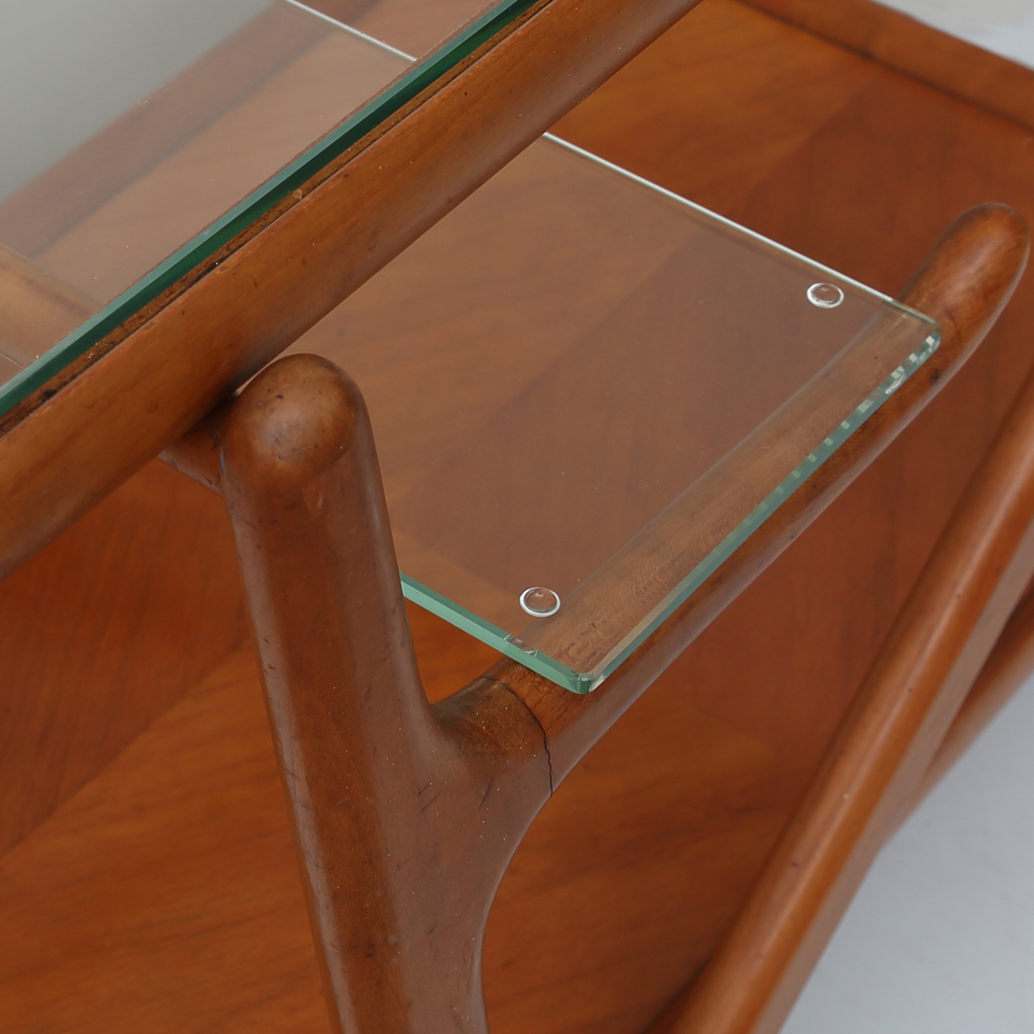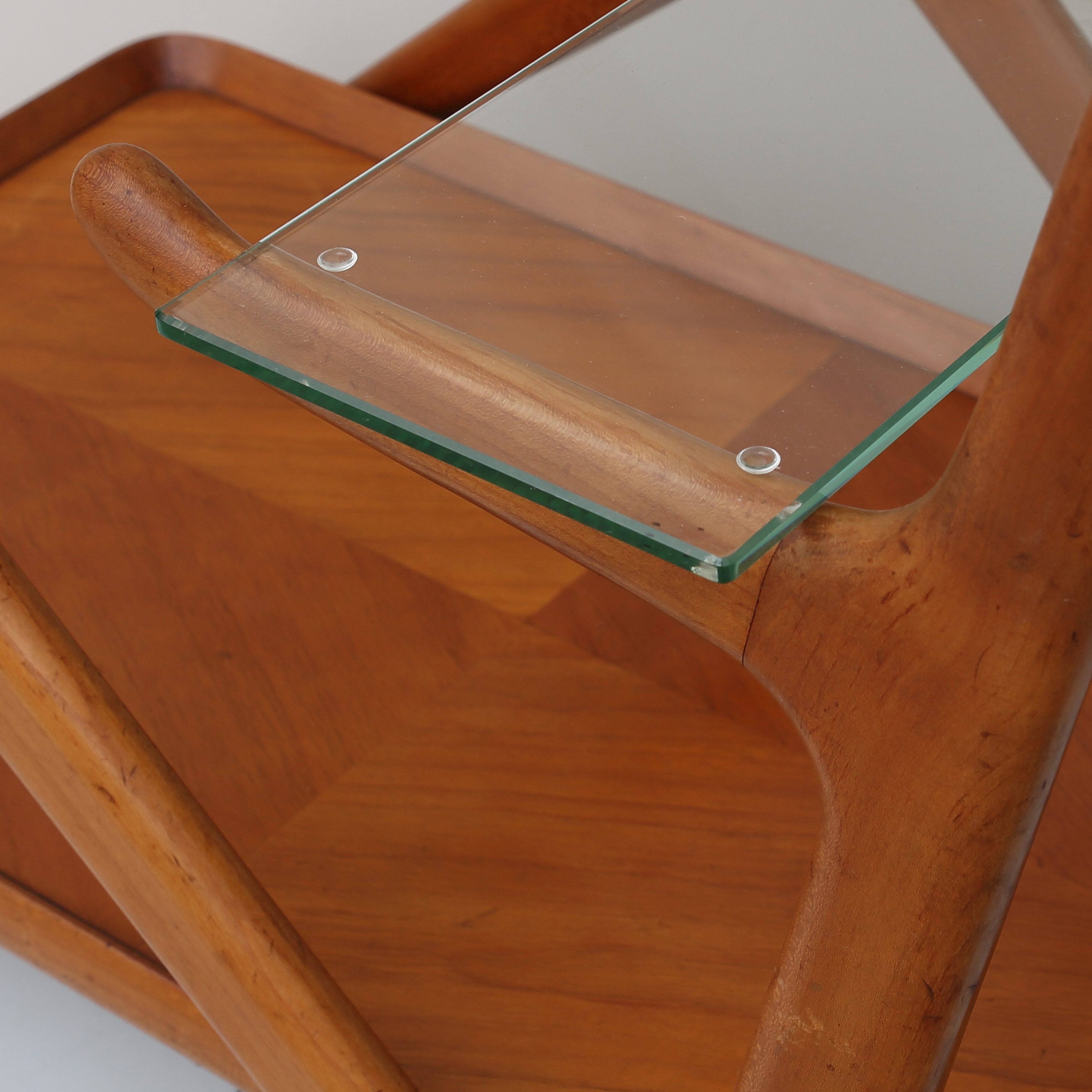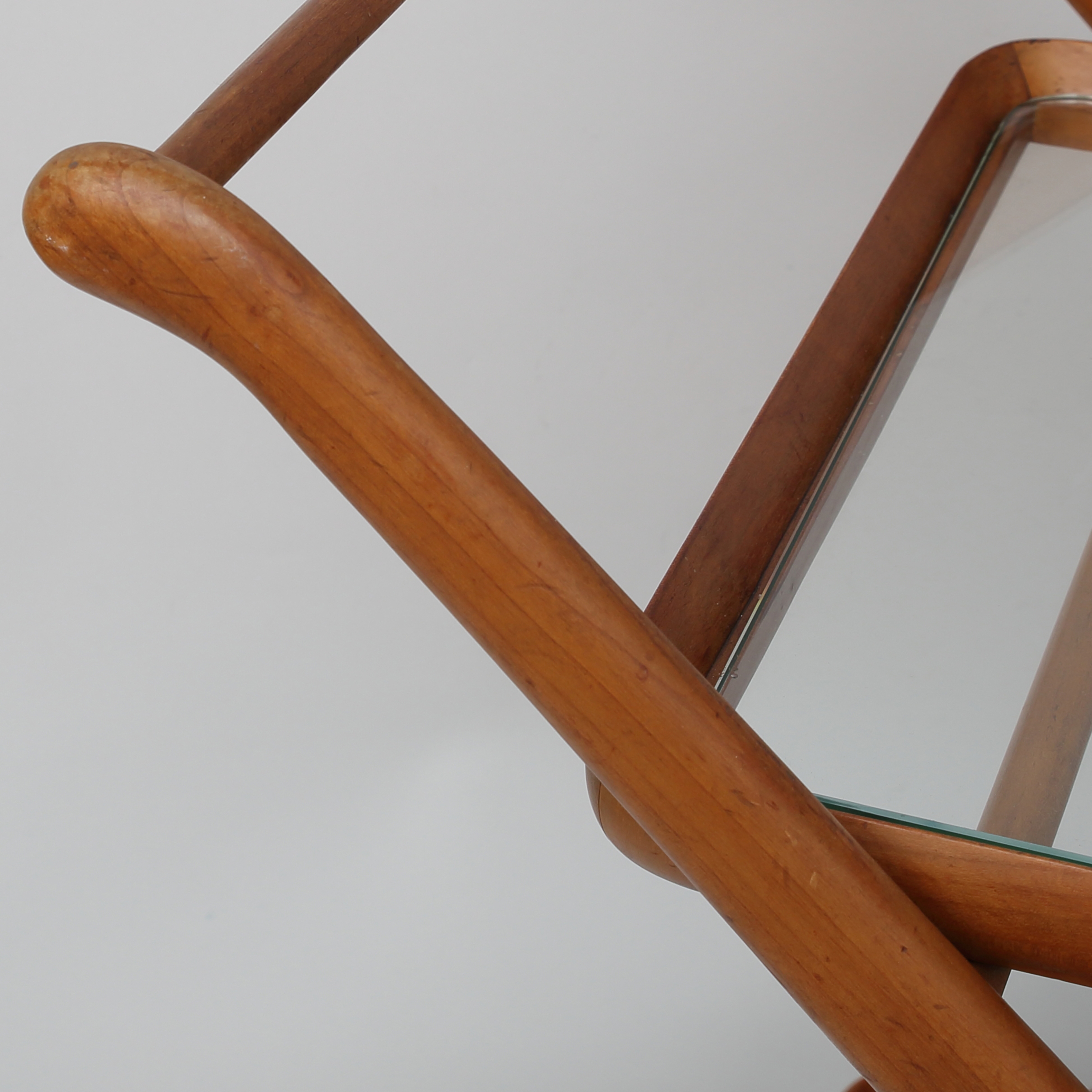 Cesare Lacca serving trolley from the 1960s, an elegant example of Italian modern design. The organic wooden frame, the glass top and the removable tray clearly express the refined formal language and functional approach that are characteristic of Lacca’s work. The design was first developed in 1951 for Cassina.