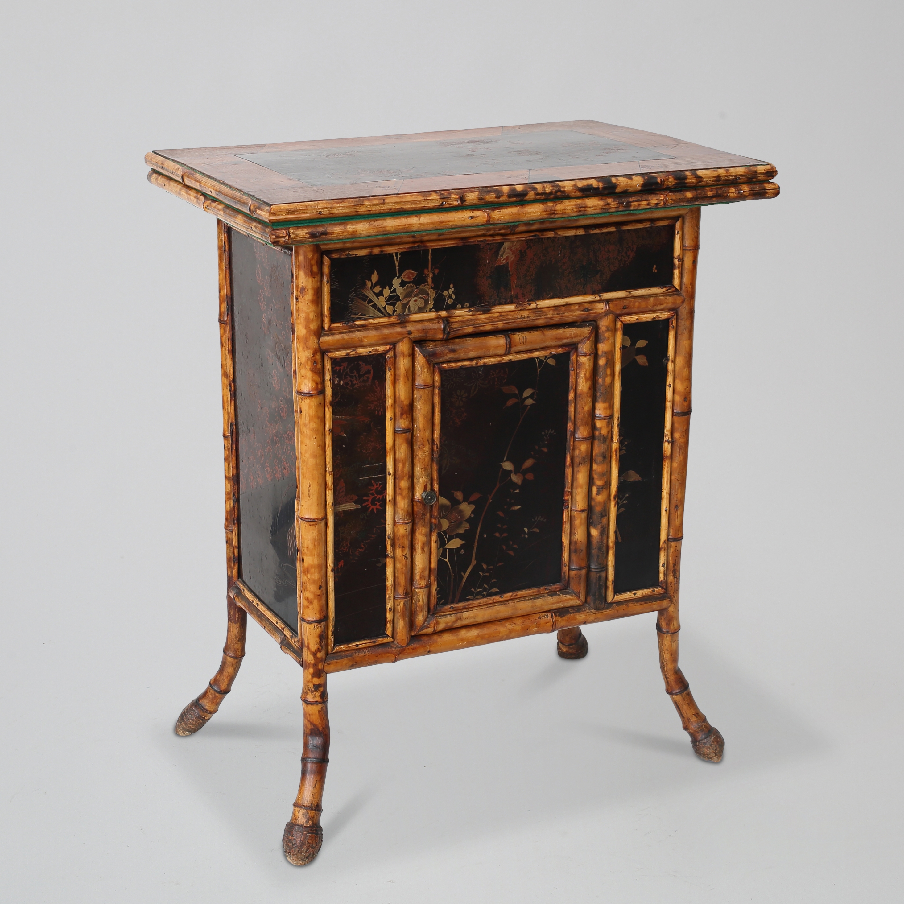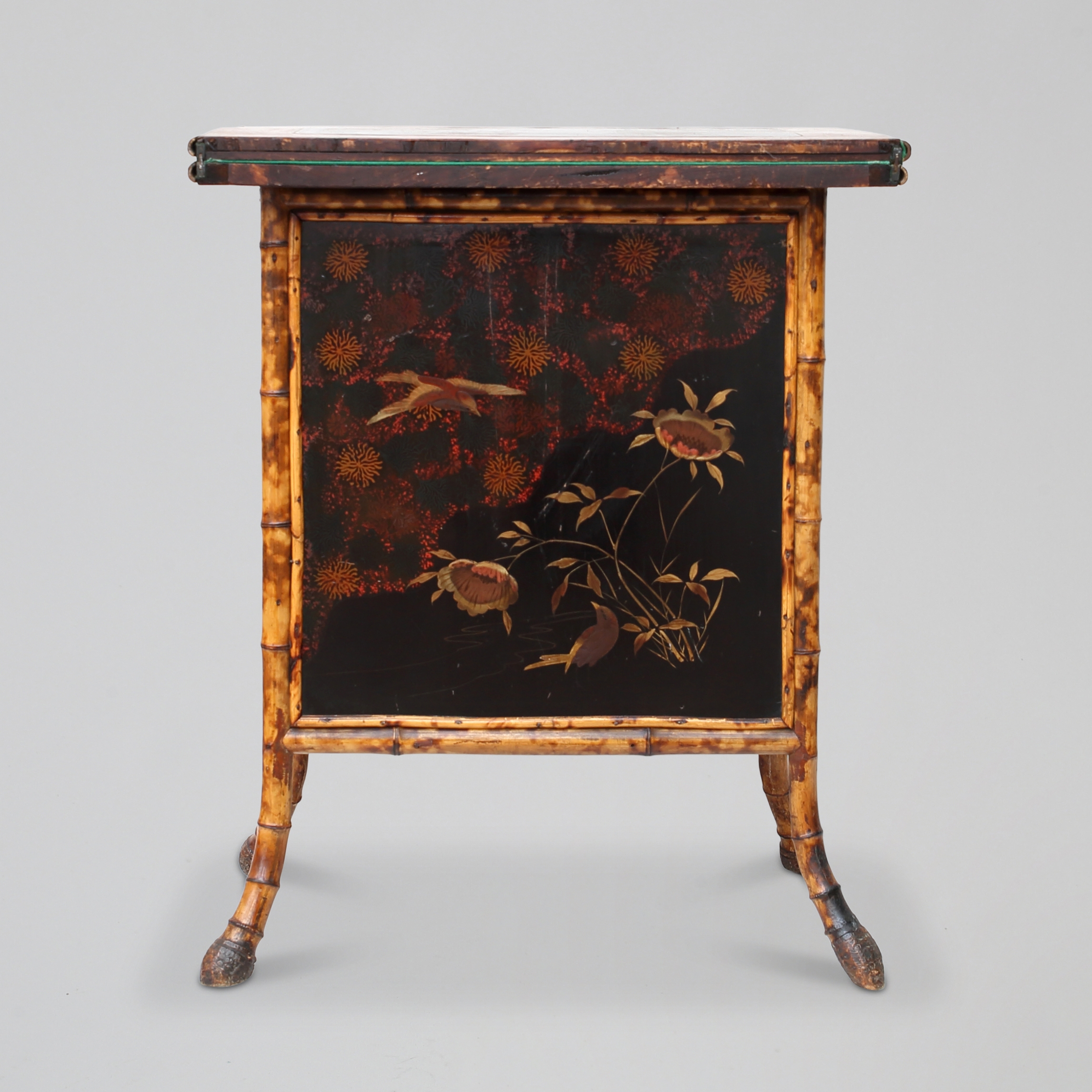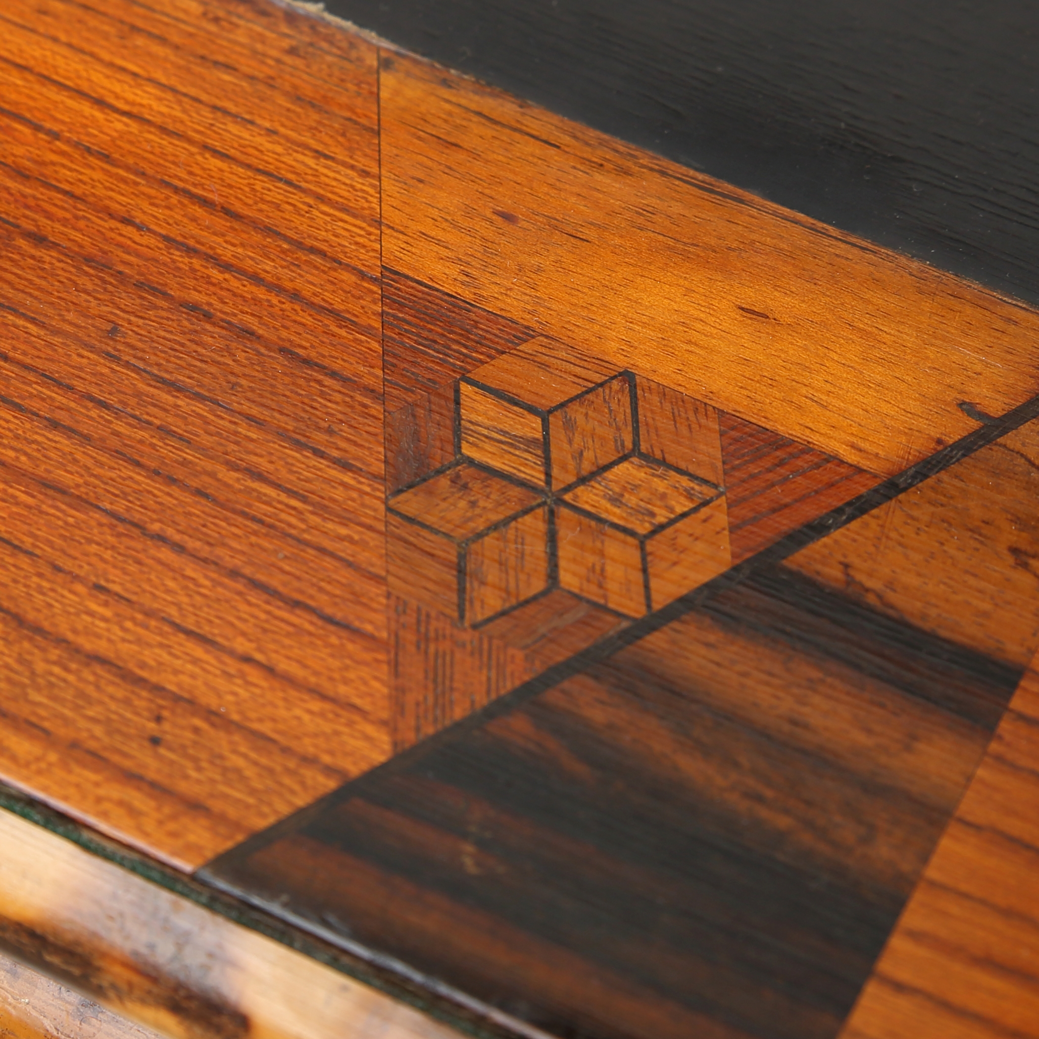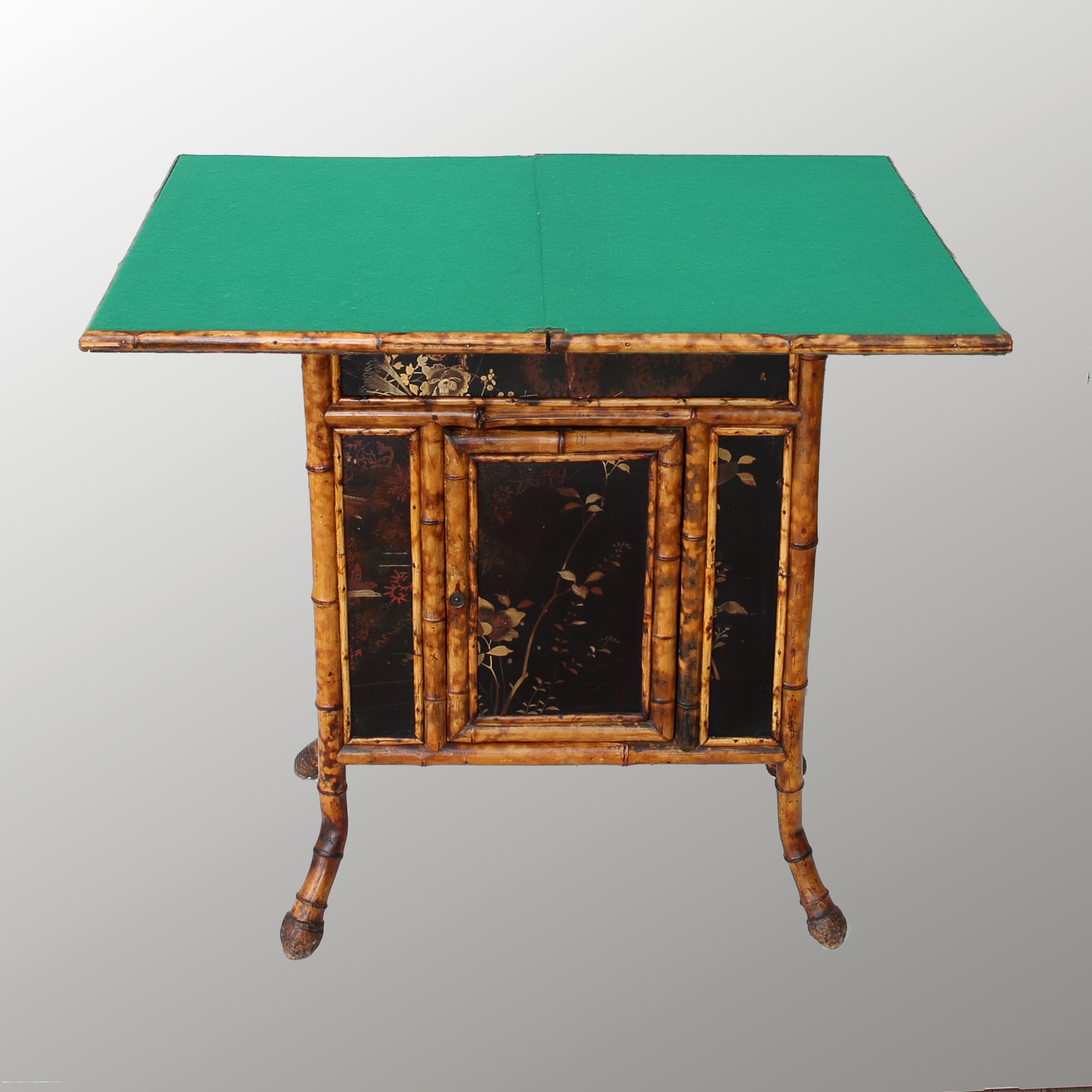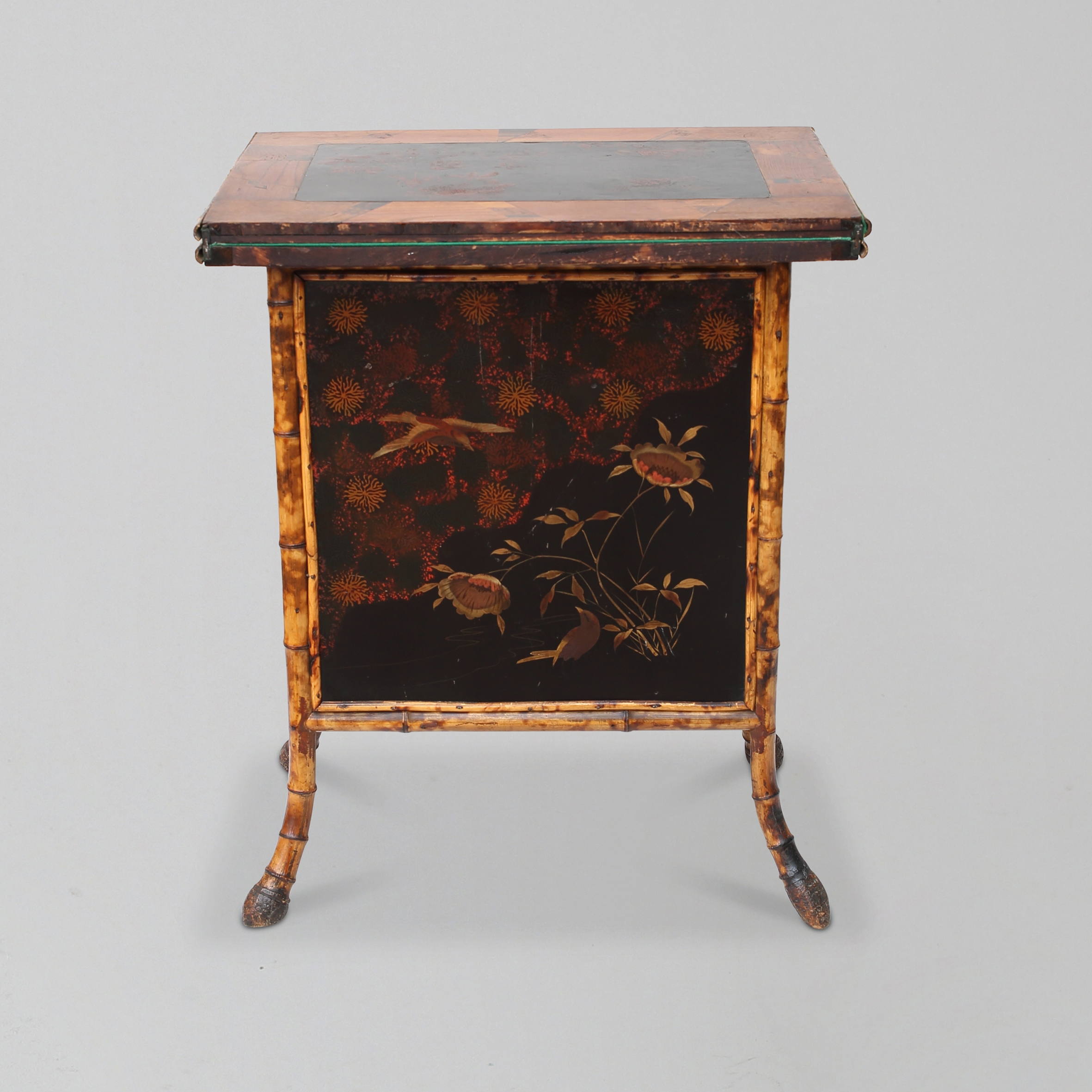This unique table is made from bamboo, wood marquetry and leather. The top can be removed and opened to play cards.