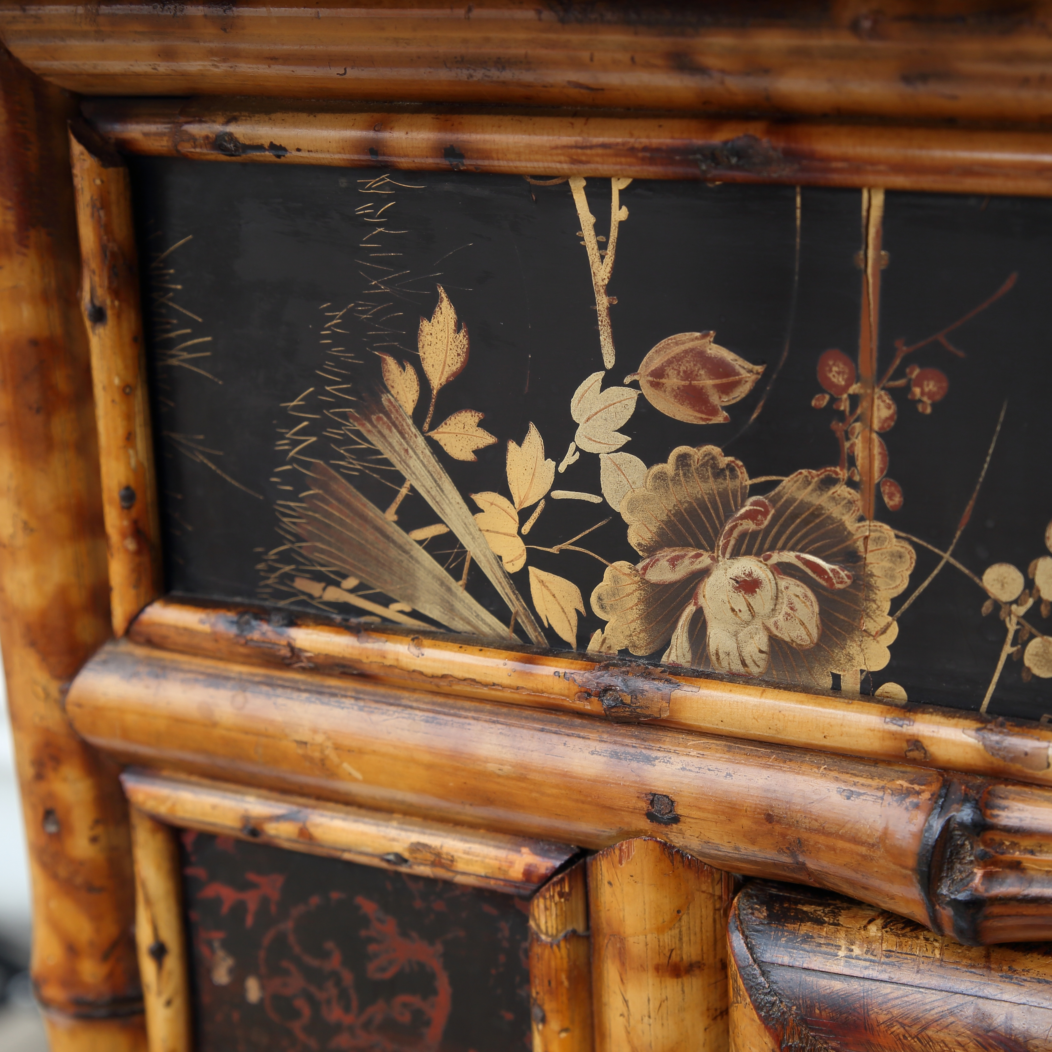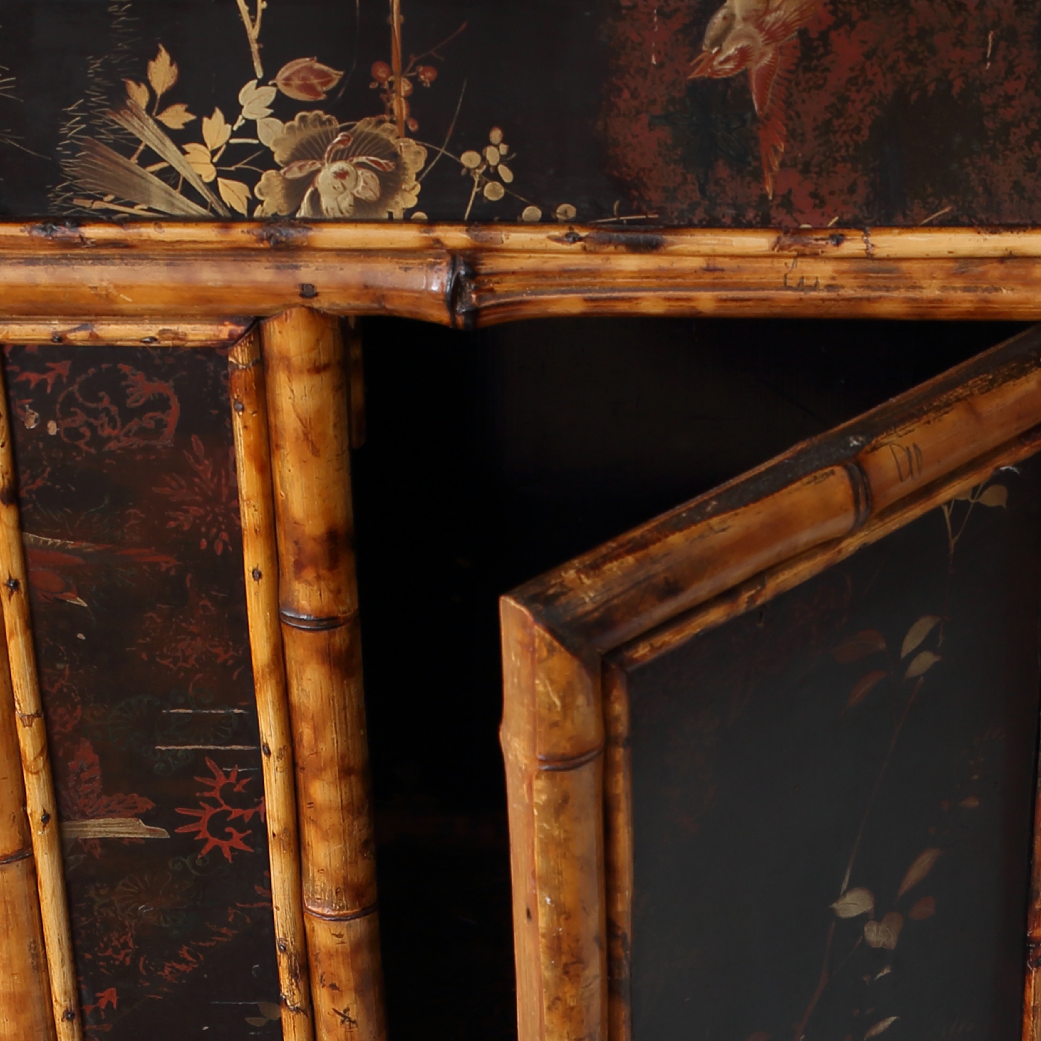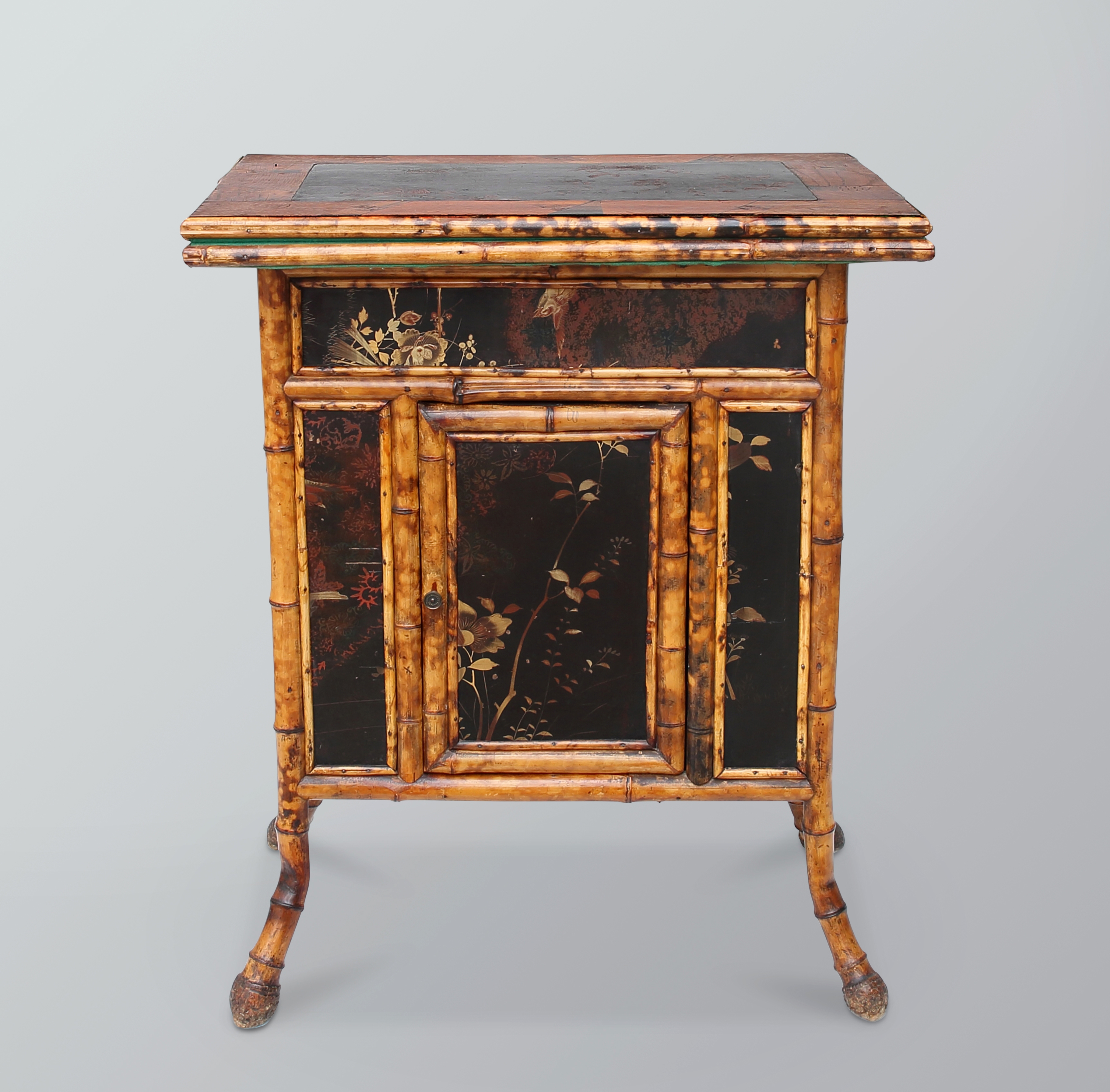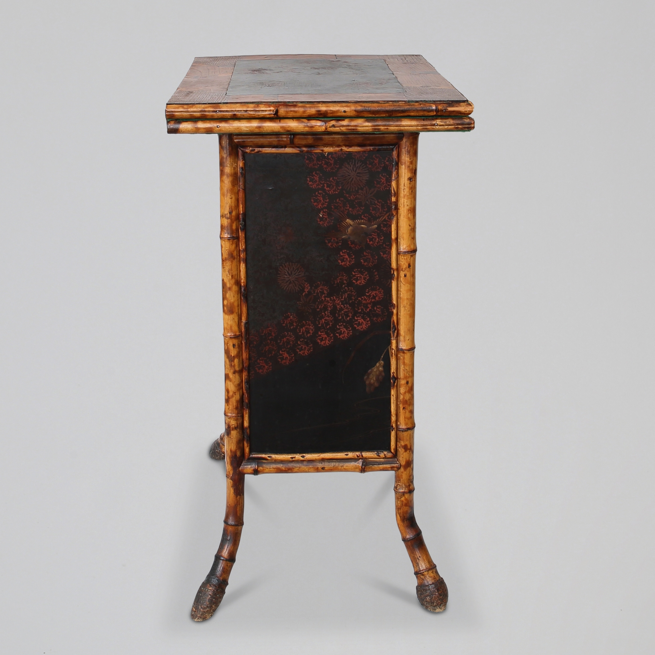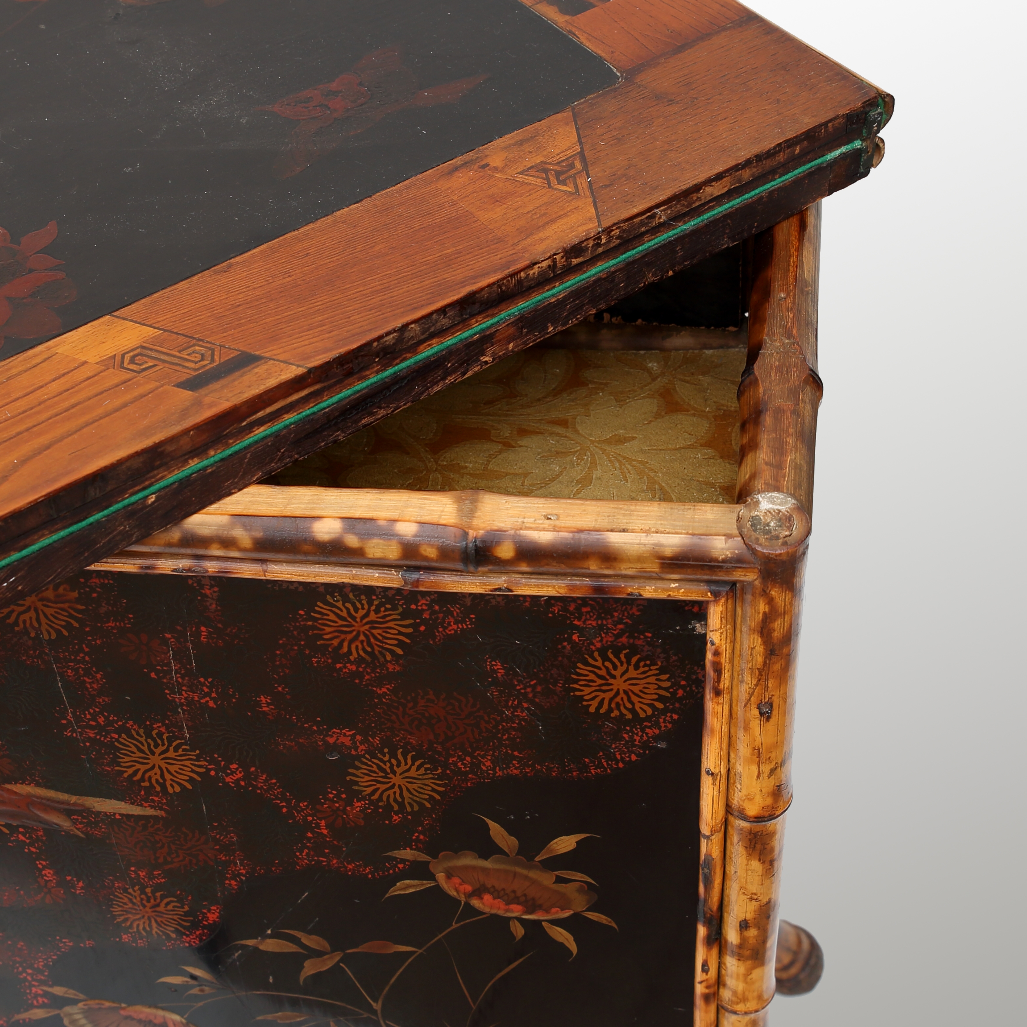 This unique table is made from bamboo, wood marquetry and leather. The top can be removed and opened to play cards.