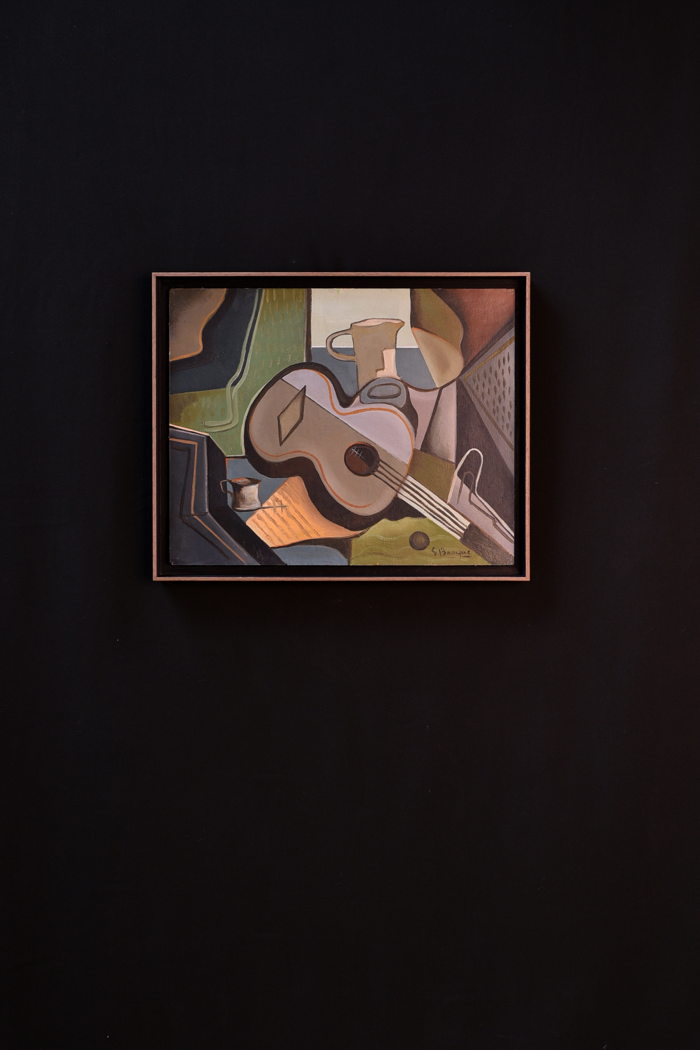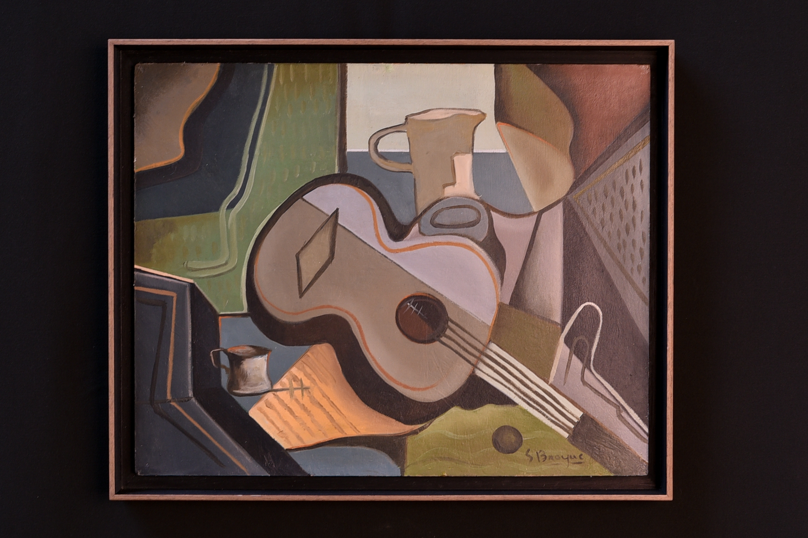 Cubist painting with guitar, signed Georges Braque (but we do not have a certificate to prove authenticity). Beautiful composition and combination of colours. Oil on canvas. The painting was given a new frame in walnut. It is in very good condition.
